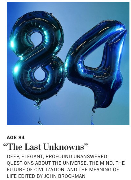. . . 4. John Brockman, editor, The Last Unknowns: Deep, Elegant, Profound UNANSWERED QUESTIONS About the Universe, the Mind, the Future of Civilization, and the Meaning of Life. My nominated question was: “How far are we from wishing to return to the technologies of the year 1900?” NB: you get only the questions, not the answers. . . .
