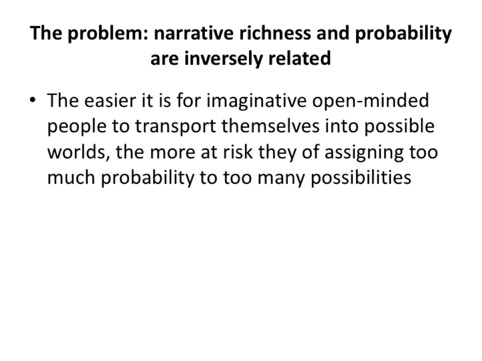 This also ties in somewhat to this vexing problem of people’s judgments of explanations and forecasting accuracy because we are tempted by rich narratives. It’s easy for us to transport ourselves imaginatively into the more detailed narrative that’s more interesting, more engaging. It’s a better story. And of course, it’s less probable. You don’t want to get suckered by attribute substitution. You don’t want to replace the question, is this an accurate forecast? with, is this interesting story? It is tempting in many situations to do that. I make that point on slide 119.