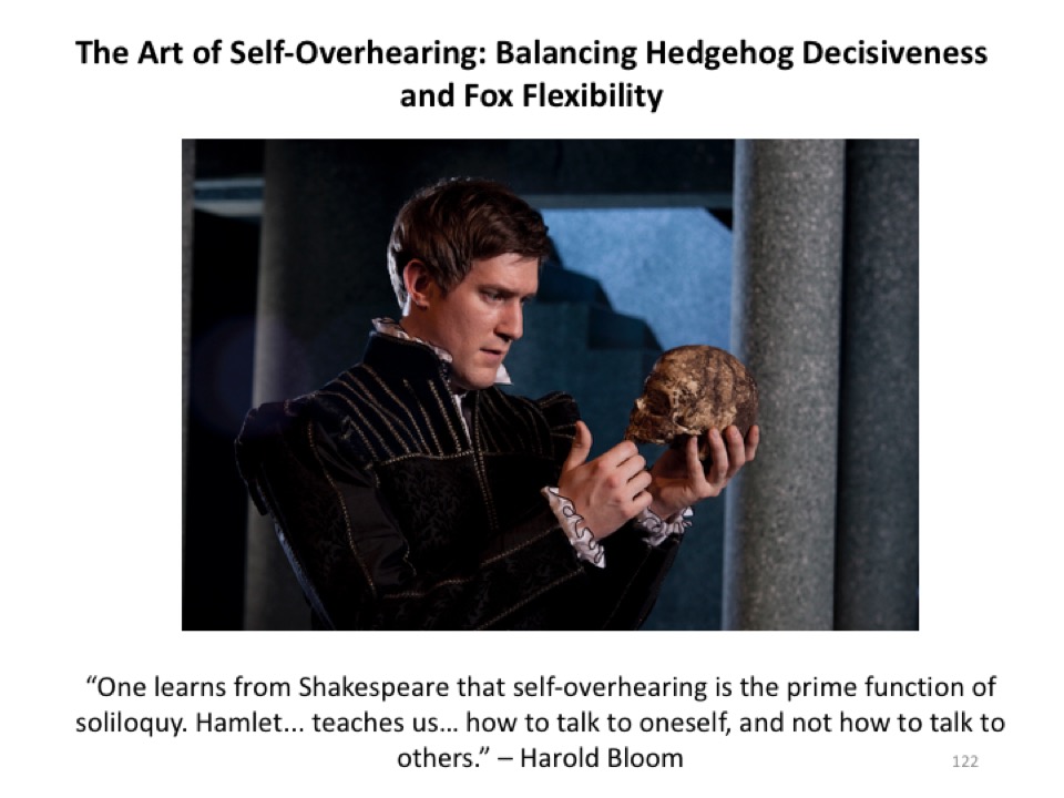 What are we trying to do in the biggest picture sense? The last slide is a quote from an English professor at Yale, retired, whose name is Harold Bloom. He was a Shakespeare scholar. The quote, on slide 122, is, “One learns from Shakespeare that self overhearing is the prime function of soliloquy. Hamlet teaches us how to talk to oneself, not how to talk to others.” That’s a strange quote. What does it mean?